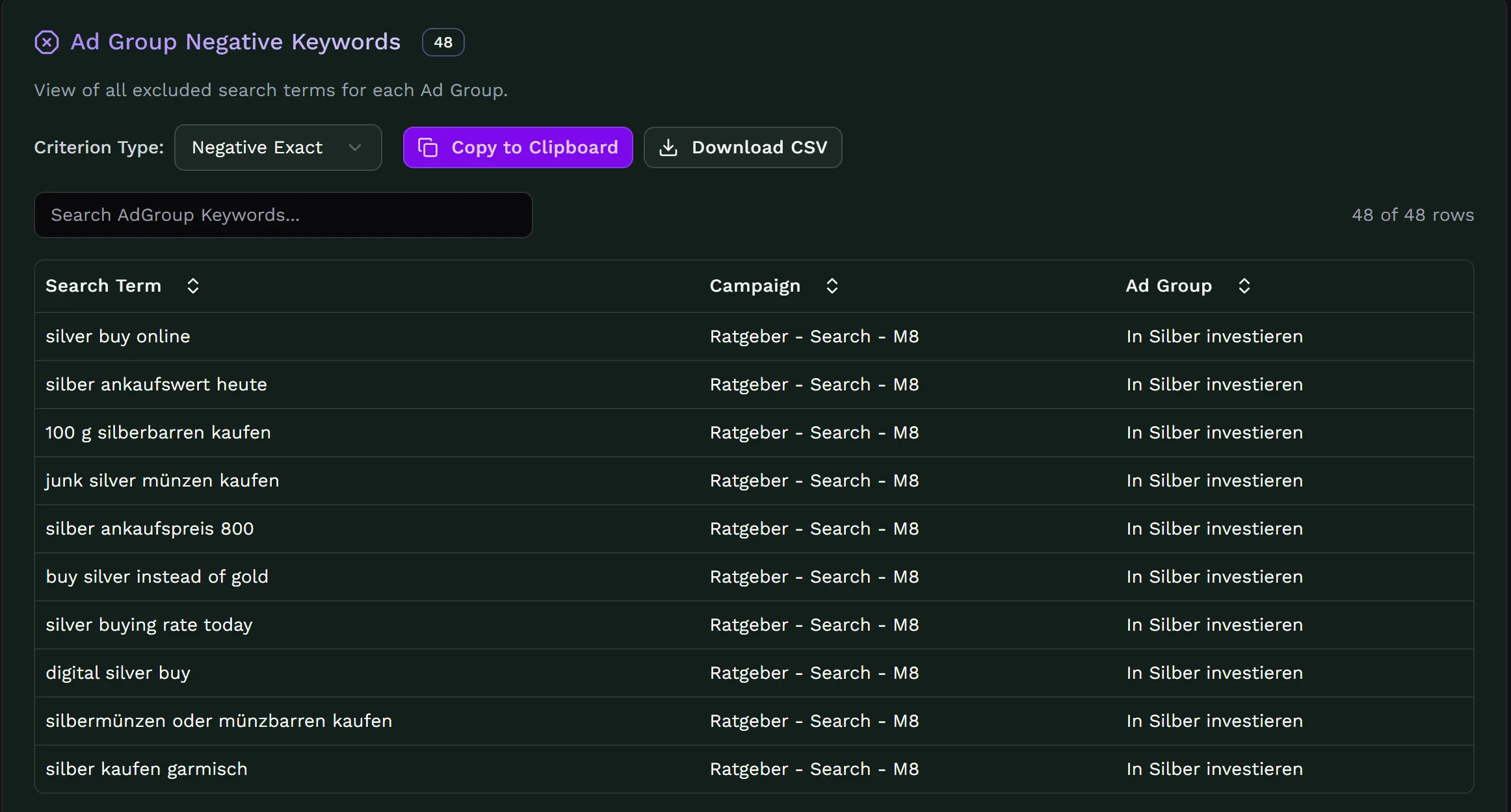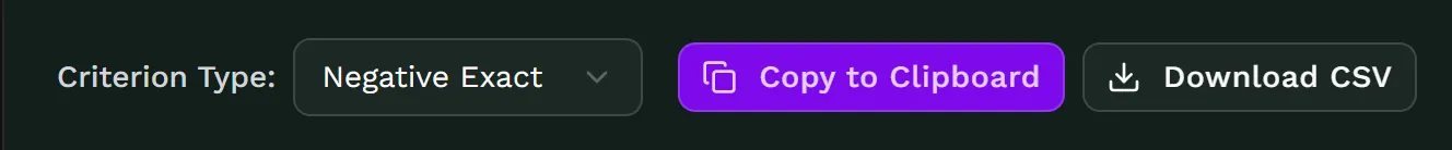 Section titled “Downloading Negative Keywords”Once everything looks good, choose the match type for your negative keywords: exact, phrase or broad. Then click “Copy to clipboard” or “Download CSV” to get your final list of negative keywords in the format you selected.