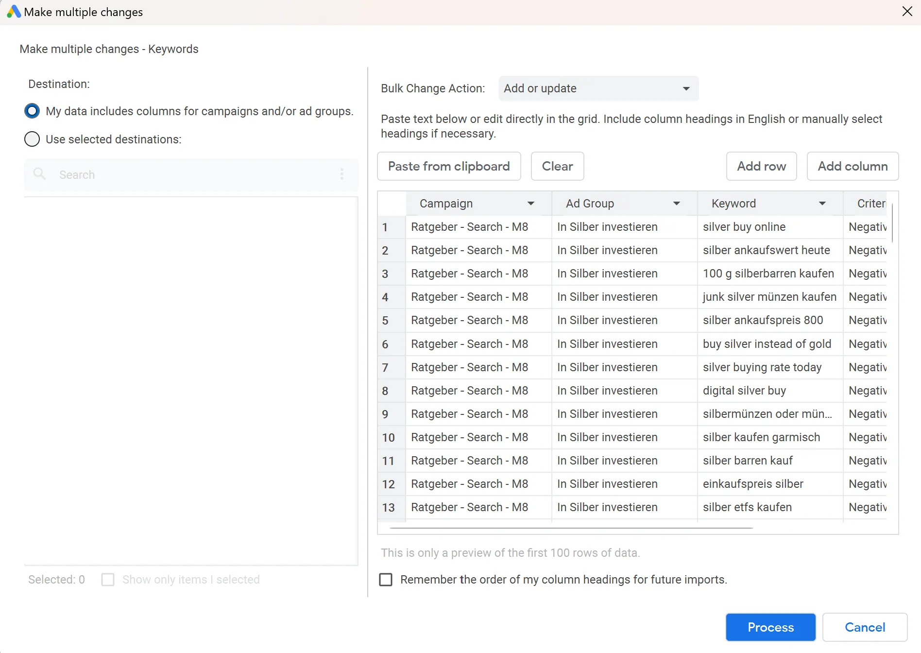 In the window that appears, select “My data includes columns for campaigns and/or ad groups”. Paste in your data from the clipboard and click “Process”.