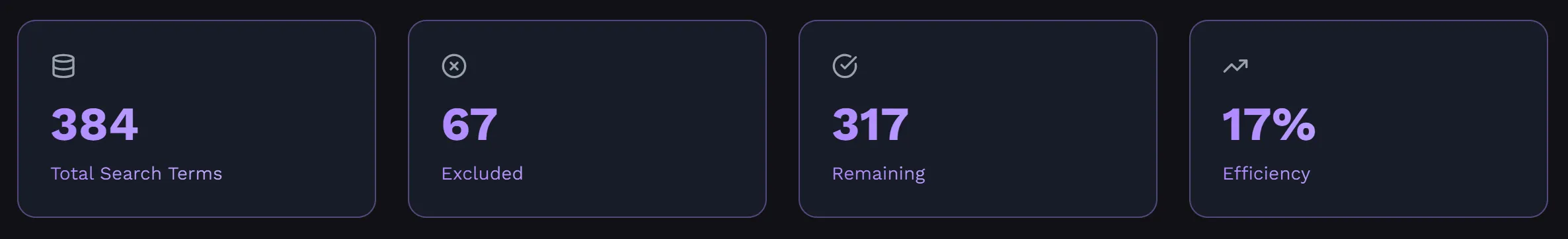 Section titled “Efficiency”This metric displays the percentage of excluded search terms relative to the total – giving you a quick sense of how effectively your patterns are filtering irrelevant queries.