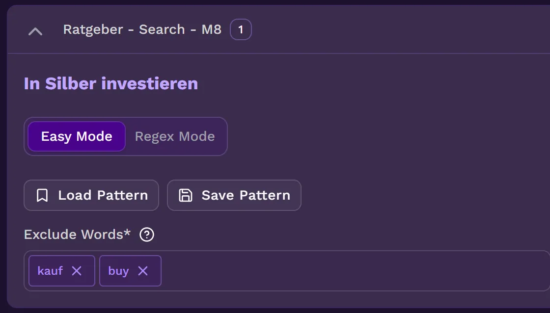 - For example, if the critical components are “kaufen” and “buy”, enter these words one by one – either as excluding or safeguarding patterns. Confirm each entry by pressing the Enter key on your keyboard.